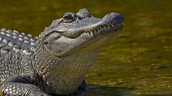 They are large animals with powerful tails that are used both in defense and in swimming. Their eyes, ears, and nostrils are placed on top of their long head and project slightly above the water when the reptiles float at the surface, as they often do.